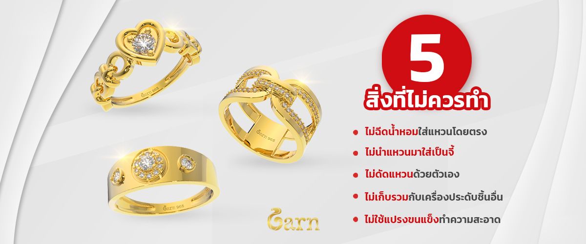 • ไม่นำแหวนมาใส่เป็นจี้ ด้วยความสวยงามของแหวนทองคำ อาจทำให้หลาย ๆ คนคิดอยากจะนำแหวนมาร้อยกับสร้อย แล้วนำไปสวมใส่เป็นจี้ แต่รู้หรือไม่ว่า การทำเช่นนี้จะทำให้ตัวแหวนต้องเสียดสีกับสร้อยตลอดเวลา จนทำให้แหวนเกิดรอยขีดข่วนหรือบิ่นได้